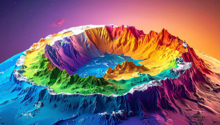 An AI generated illustration of an aerial view of a crater located on a hillside