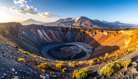 Captivating aerial shot showcasing a volcanic caldera amidst rugged earth tones, emphasizing the natural beauty and unique geological features of this remote landscape.