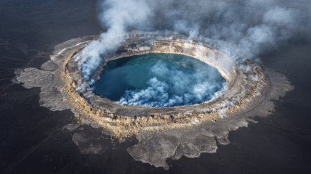 An aerial perspective showcases a volcanic crater filled with turquoise water. Wisps of steam rise from the water, contrasting with the dark surrounding landscape. The circular composition highlights the natural patterns. Suitable for illustrating earth science, environmental themes, or design projects.
