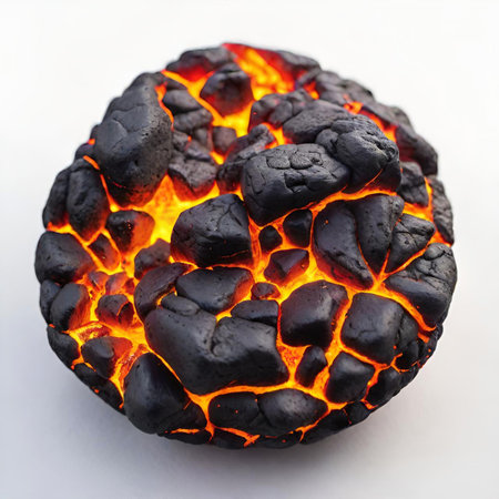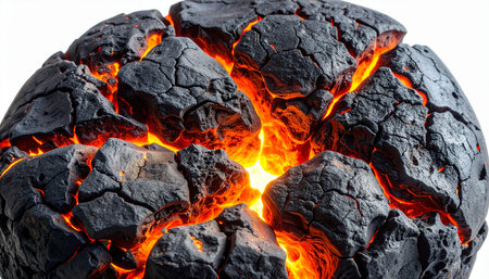 A spherical cluster of dark, cracked volcanic rock reveals a bright, glowing orange and red molten lava core.