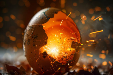 A striking image of a glowing cracked egg, with vibrant sparkling light spilling from it against a dark background, symbolizing creation and wonder.