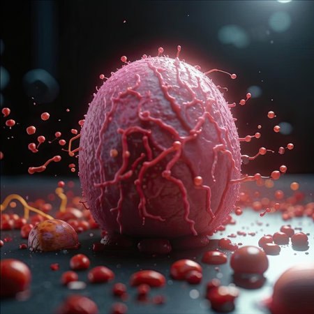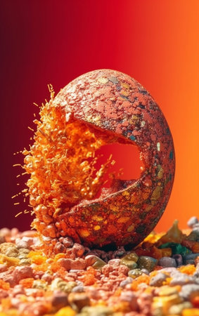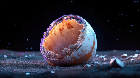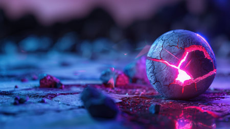 A glowing cracked sphere rests on a textured surface, surrounded by vivid colors and dramatic lighting, creating an enchanting atmosphere ideal for creative projects.