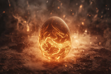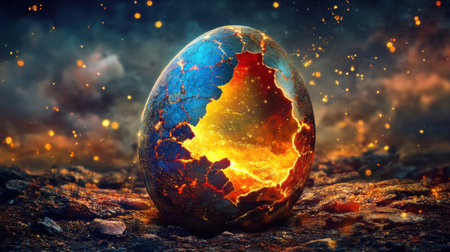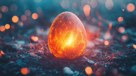 This stunning image features a cracked egg radiating an inner glow, set against a fiery terrain filled with vibrant colors and dynamic light.