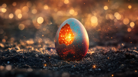 A mesmerizing close-up of a cracked egg on rocky ground, emitting a warm glow and sparks, symbolizing new beginnings and magical transformations.