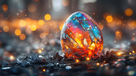 This image showcases a vibrant and colorful egg with a luminous fire effect and a crystal-like texture, surrounded by enchanting bokeh lights.