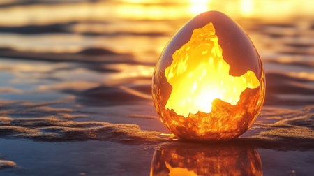 A stunning golden egg radiating warmth on a tranquil beach at sunset, surrounded by soft waves and textured sand, inviting creative interpretations.