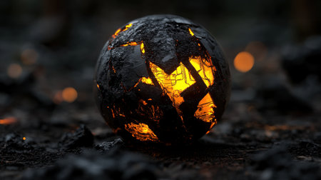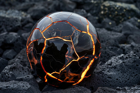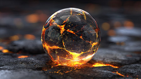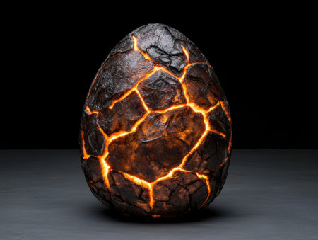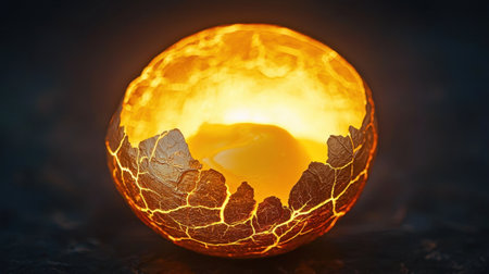 A mesmerizing cracked sphere emits a warm glow from within, resting on a dark textured surface. This striking image explores themes of transformation and creativity, inviting contemplation.