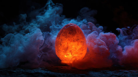A captivating glowing crystal egg is nestled amidst vibrant colorful smoke in a dark setting, creating a mystical aura and enchanting scene.