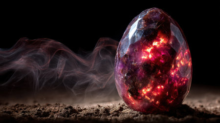 A striking crystal egg emits a radiant glow with swirls of red and purple light, set against a mysterious black background, creating an enchanting atmosphere.