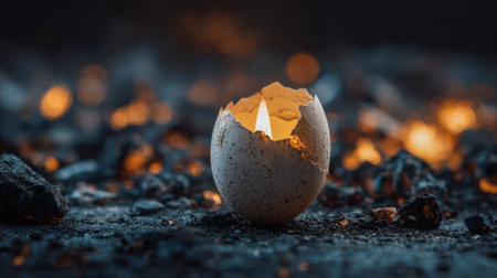 A fragile eggshell fragment shines softly from inside, its glow casting a warm ambiance on a textured dark surface, enhanced by delicate bokeh light circles.
