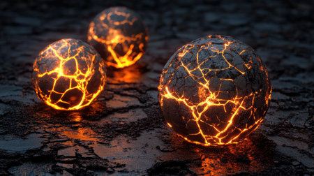 A captivating scene featuring glowing cracked orbs resting on a dark surface, with fiery interiors illuminating the surroundings in a mystical volcanic setting.