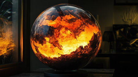 A fiery Earth encased in a glass globe that's cracking under heat pressure, symbolizing fragility of the planet