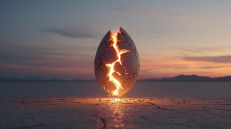 A stunning image of a cracked egg glowing with light at sunset over a serene desert landscape, representing new beginnings and creative potential.