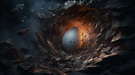 an egg thrown out of a rock hole, rendered in cinema4d, showcases an atmospheric abstraction with monochromatic chaos. the artwork features realistic bird paintings, embodying elements of apocalypse art. the composition exudes chaotic energy with a dark orange and gray color palette. ai generated