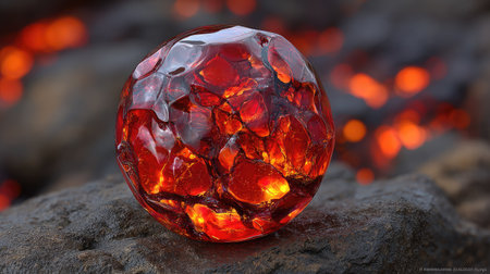 Red Crystal Ball on the Volcanic Rocks with Flames on the Background