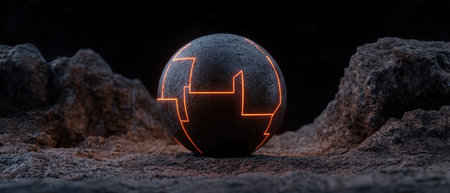 abstract ball sphere dark planet like shape modern design with glowing orange light and dark surface with reflections 3d render illustration