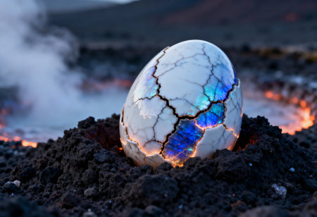 Glowing cracked gemstone egg emerging from volcanic ground emitting light with mystical energy and vibrant colors.