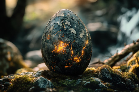 A textured egg with glowing cracks sits on vibrant moss in a serene forest environment, illuminated by soft light.