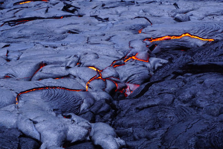 Hot magma of an active lava flow over old lava field, the lava cools slowly and solidifies, Kilauea, Big Island, Hawaii