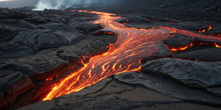 Flowing lava stream on volcanic rock surface, glowing orange against a dark textured landscape with rugged terrain and cooling lava formations visible