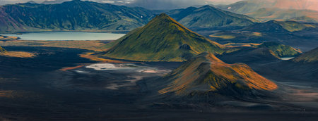 Landmannalaugar landscape at summer sunset, panoramic view.