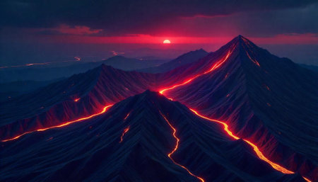 Dramatic volcanic eruption at night, rivers of glowing lava