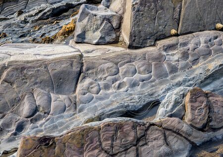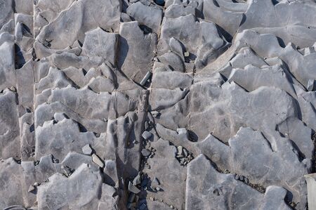 Sea cracked granite textured rock concept photo. Mediterranean sea rough surfaces. Close up stone background for design. Texture in nature for wallpaper. High quality picture for wallpaper