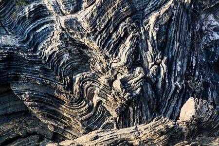 Closeup of layered wavy black rock surface texture. Barents Sea coast, Rybachy Peninsula, Russia