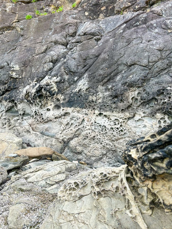 Intricate honeycomb weathering patterns on coastal rocks shaped by erosion and time. A stunning display of natural artistry.