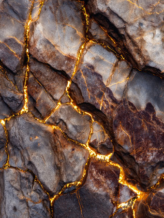 A rugged, shadowed terrain reveals fiery fissures shimmering with a warm, golden glow, creating a striking contrast against the dark, textured stone surface.