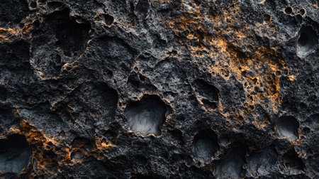 Detailed view of a rock surface resembling a lunar landscape, featuring irregular craters and a rough texture. the dark-toned, naturally eroded surface adds depth and interest, ideal for backgrounds and textures in creative design projects. Generative AI