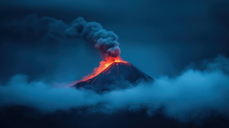 A dramatic night shot of an active volcano erupting, sending a massive plume of ash and smoke into the sky. Glowing red lava flows down the mountain slopes, illuminating the dark landscape with fiery light.