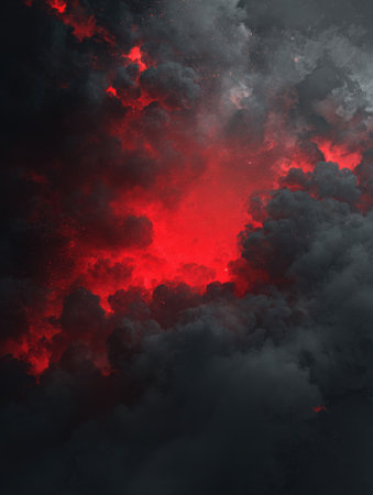 A powerful scene shows dark storm clouds in turmoil, with bright red light breaking through, creating a dramatic contrast against the dark backdrop.