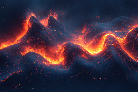 Vivid depiction of a landscape formed by flowing, molten lava, creating an abstract design of fiery mountain ranges. The image's dramatic use of light and color conveys a sense of heat, power, and vastness.