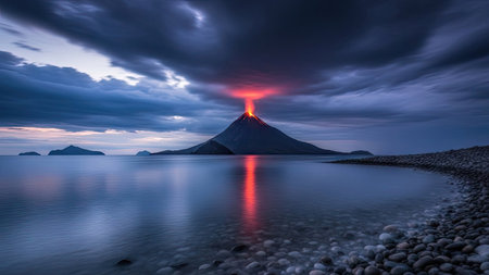 A volcano erupts dramatically, spewing glowing lava against a backdrop of a dark, stormy sky. The foreground shows a calm sea, reflecting the volcanic glow. The scene features a dramatic composition with balanced lighting and colors. Suitable for various editorial and commercial projects needing evocative imagery.