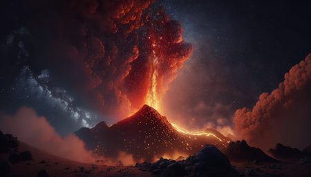 Dramatic image of a volcano erupting at night, with a fiery plume of smoke and lava rising into a starlit sky. The volcano is positioned against a vast expanse of dark, star-studded night sky.