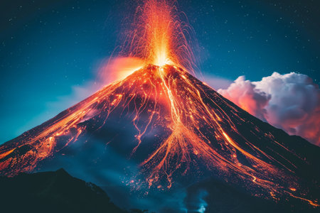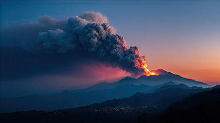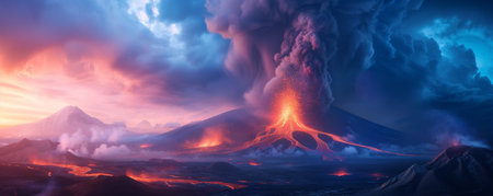 A towering volcano erupts in spectacular fashion, spewing molten lava and ash against a dramatic twilight sky, creating a scene of raw natural power and beauty
