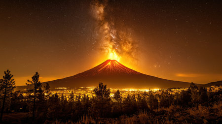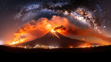 Breathtaking nighttime view of a volcano erupting with vivid orange flames against a backdrop of a spectacular milky way galaxy. The city lights below add a contrasting element to the powerful natural scene. The overall composition is dramatic and visually striking.