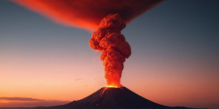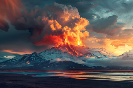 A volcano erupts, spewing smoke amidst a vibrant sunset. The sky displays hues of red and orange, with dark clouds adding contrast. A reflective water surface mirrors the dramatic scene. Suitable for illustrating natural disasters or environmental themes. Offers potential for use in educational or commercial materials.