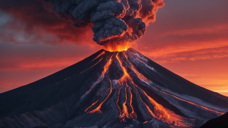 AI Generated. Majestic volcano erupting at sunset with dramatic smoke and lava flow illuminating the sky and landscape in vibrant orange hues