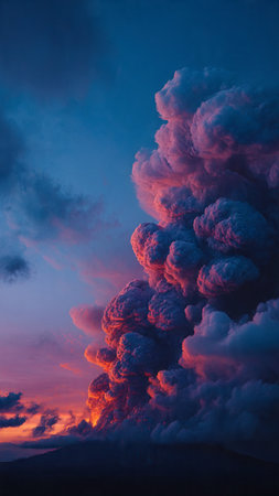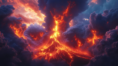 A stunning view of an erupting volcano surrounded by dark clouds and glowing lava. The dynamic scene captures the power of nature against a twilight backdrop.