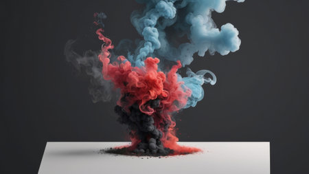 3d rendering of red and blue smoke explosion on black background.