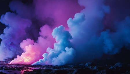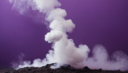 Volcanic eruption with smoke and steam on a purple background.