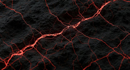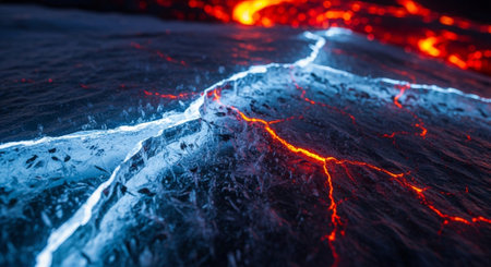 Vibrant Glowing Lava Veins Beneath Cracked Surface Formations in a Volcanic Geothermal Landscape