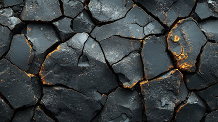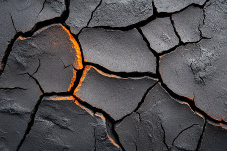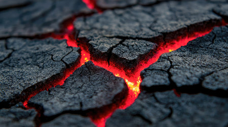Dramatic cracked surface illuminated by a fiery glow, representing the raw power of nature. This abstract image captures heat and energy from the depths of the earth.