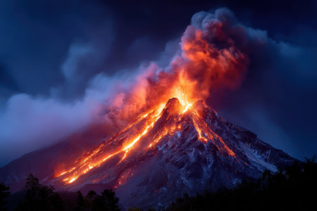 Fiery volcanic eruption with lava flows at night. Concept of active volcano, natural disaster, geological phenomenon, extreme environment.