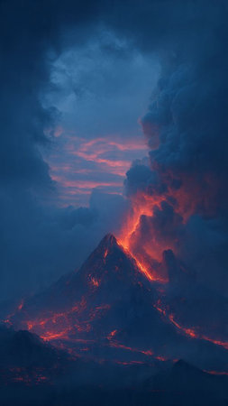 captivating scene of an active volcanic eruption, showcasing molten lava, smoke plumes, and fiery glow beneath a dramatic evening sky, exuding intense energy and natural grandeur.