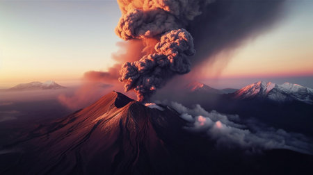 A majestic view of a volcanic mountain against a sunset, with plumes of smoke rising, illustrating the beauty and danger inherent in nature's most powerful phenomena.