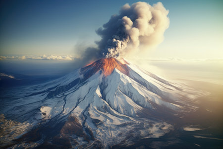 Volcanic eruption in Kamchatka Peninsula. View from helicopter, Karimskiy volcano, Volcanic eruption in Kamchatka, ash flow, and destruction, AI Generated