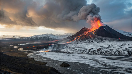 Dramatic volcano erupts, fiery lava flows, against a sky with stormy clouds.